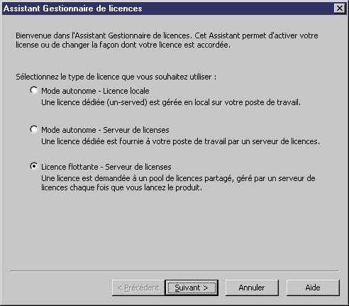 | Licence flottante - Serveur de licences | Une licence flottante serveur provient d'un pool de licences partagé sur un serveur de licences. Ce type de licence n'est pas dédié à un poste de travail et doit être emprunté et restitué au serveur de licences après utilisation. |