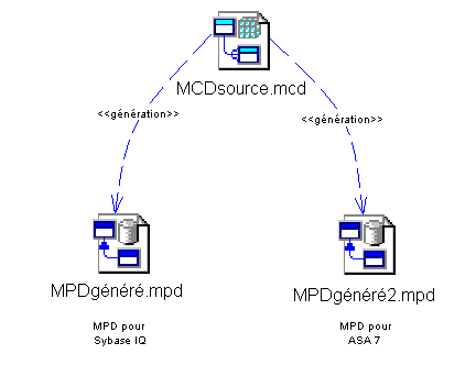 Cet exemple de génération, à partir d'un MCD, de deux MPD générés avec des SGBD différents montre que l'objet fichier MCDsource.mcd possède des dépendances étendues avec les objets fichiers MPDgénéré.mpd (pour Sybase IQ) et MPD2généré.mpd (pour ASA7). Ces dépendances étendues sont définies par un stéréotype <<génération>> qui permet d'expliquer le type de relation entre ces trois objets.