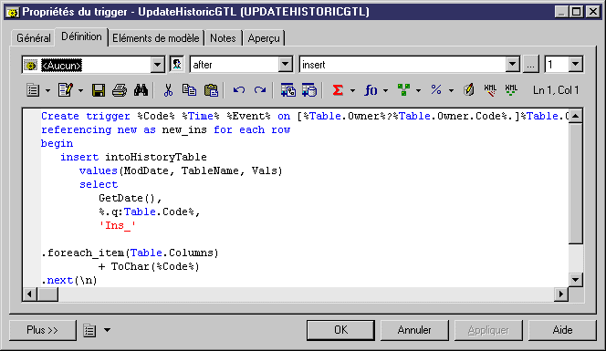 Reportez à la section Rédaction de code SQL en utilisant les variables et macros de MPD pour obtenir un exemple du même trigger écrit à l'aide des macros et variables PowerAMC: