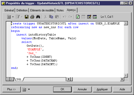 Dans l'exemple suivant, un trigger rédigé à l'aide du GTL est attaché à la table Example, et écrit le contenu de toute insertion dans HistoryTable.