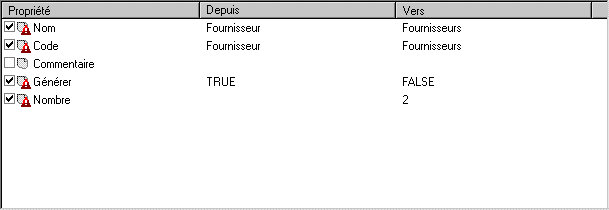 Vous pouvez double-cliquer sur une propriété dans la partie de comparaison de propriétés pour afficher les différences entre les modèles. Lorsqu'une propriété est ajoutée, le symbole suivant >> s'affiche. Lorsqu'une propriété est supprimée, le symbole suivant << s'affiche.