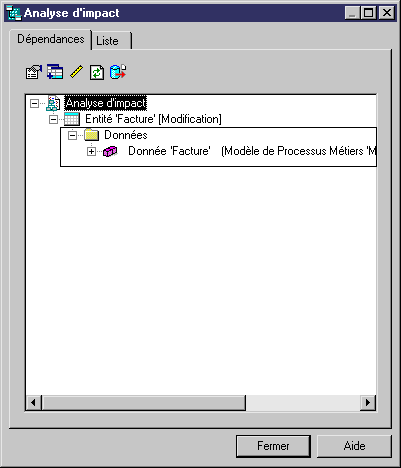 Lorsque vous exportez des données vers les MCD, MPD ou MOO, vous pouvez afficher la feuille de propriétés du nouvel objet, cliquer sur l'onglet Dépendances et cliquer sur le bouton Analyse d'impact pour afficher le lien entre le nouvel objet et les données dont il provient.