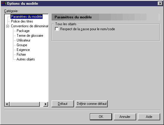 | Respect de la casse pour le nom/code | Vous pouvez définir le respect de la casse des noms et codes pour tous les objets dans le modèle courant. Si vous cochez cette case, deux objets peuvent avoir le même nom ou code dans un même espace de noms, à condition que la casse du nom ou du code diffère. Vous pouvez modifier cette option pendant le processus de développement. Toutefois, si vous modifiez sa valeur, n'oubliez pas de lancer une vérification du modèle pour vous assurer que ce dernier ne contient pas de doublon. |
