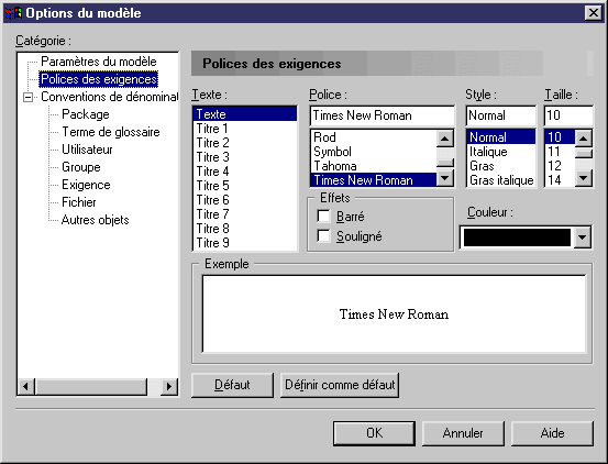 Pour définir les options de modèle relatives aux polices pour les exigences, sélectionnez Outils→Options du modèle, puis cliquez sur la sous-catégorie Polices des exigences dans le volet Catégorie.