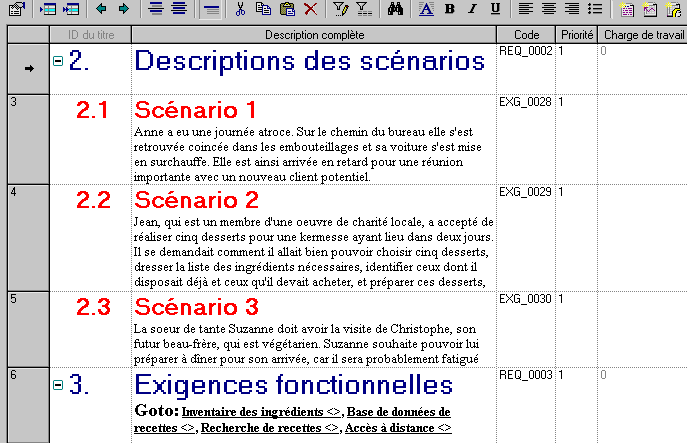 Les vues Document des exigences sont des grilles dans lesquelles vous pouvez créer des hiérarchies d'exigences en texte riche :