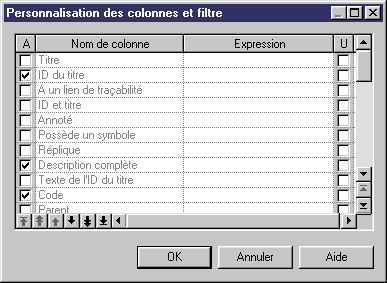- Cliquez sur l'outil Personnaliser les colonnes et filtrer pour afficher la boîte de dialogue Personnalisation des colonnes et filtre.