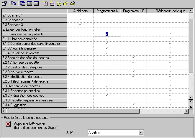 Les vues Matrice des affectations des utilisateurs sont des grilles qui affichent les liens entre les exigences (représentées par des lignes) et les utilisateurs ou les groupes (représentés par des colonnes) qui doivent satisfaire ces besoins dans le cadre d'un processus de développement.