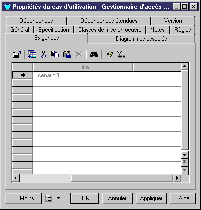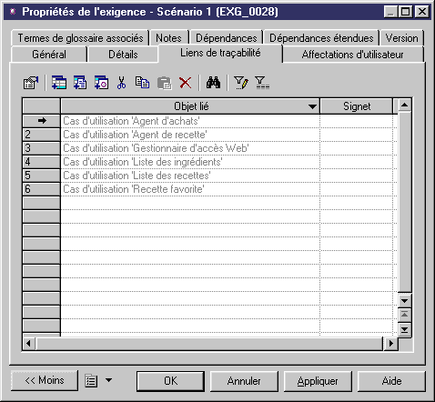 - Dans la feuille de propriétés de l'objet de conception, cliquez sur l'onglet Exigences pour afficher la liste des exigences attachées à l'objet de conception.