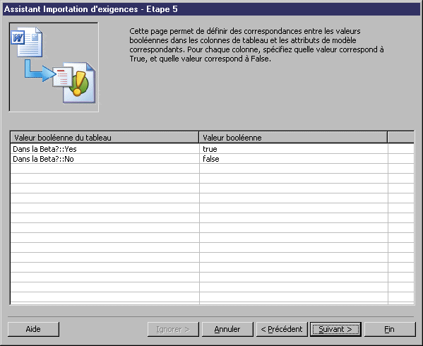 - Cet écran permet de lier des valeurs dans n'importe quel colonne mise en correspondance avec un attribut booléen à une valeur true ou false pour cet attribut. Sélectionnez la valeur appropriée pour chaque paire de valeurs de chaque colonne booléenne, puis cliquez sur Suivant pour passer à l'écran suivant :