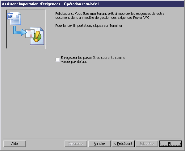 - Cet écran final vous invite à enregistrer vos paramètres courants comme valeurs par défaut. Cliquez sur Terminer afin de lancer l'importation.