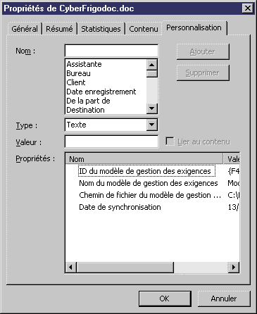 Un document Word est lié à un MGX (ou à un package de MGX) via des propriétés personnalisées et des balises d'exigences, et les détails de ce lien sont affichés dans l'onglet Personnalisation de la feuille de propriétés du document Word.
