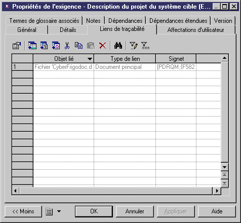 Le lien vers le document est également affiché dans l'onglet Liens de traçabilité de la feuille de propriétés du modèle et de chacune des exigences.