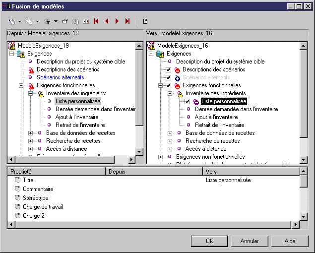 - Sélectionnez ou désélectionnez le titres à importer, puis cliquez sur Terminer pour lancer la mise à jour. La boîte de dialogue Fusion de modèles s'affiche, avec la structure du document Word modifié affichée dans le volet gauche, et le MGX existant dans le volet droit :