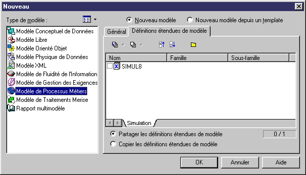 Lorsque vous créez un nouveau MPM, ou que vous procédez à son reverse engineering dans un nouveau MPM, vous pouvez choisir une ou plusieurs définitions étendues de modèle et les attacher au modèle à partir de la boîte de dialogue Nouveau :