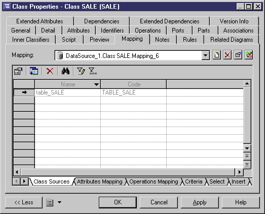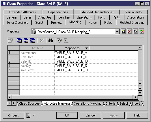 Double-click a class to display its property sheet, then click the Mapping tab.
