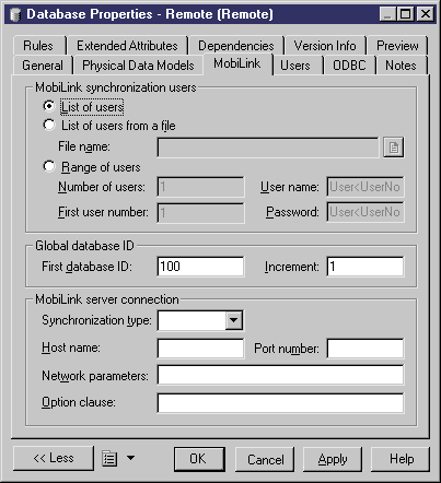 | Network parameters | Optional network parameters for MobiLink user. For more information, see the MobiLink documentation for the "Create Synchronization User" command | |