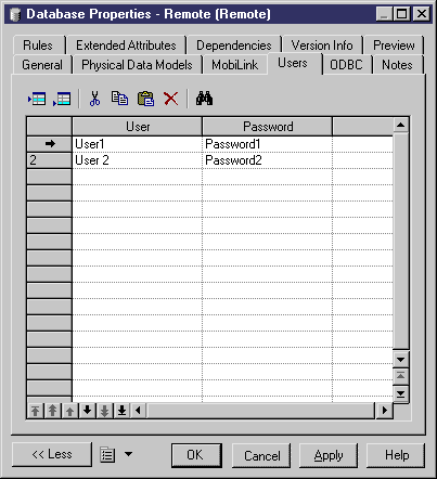From the Users page of the property sheet of a remote MobiLink database, you can define a list of user names and passwords. You must previously select the List of users radio button in the MobiLink page of the property sheet of the remote MobiLink database to display that page: