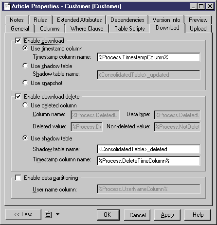 | Use shadow table | Allows you to determine if a row has been deleted since last download. When using shadow table, triggers need to be used to maintain the shadow table | |