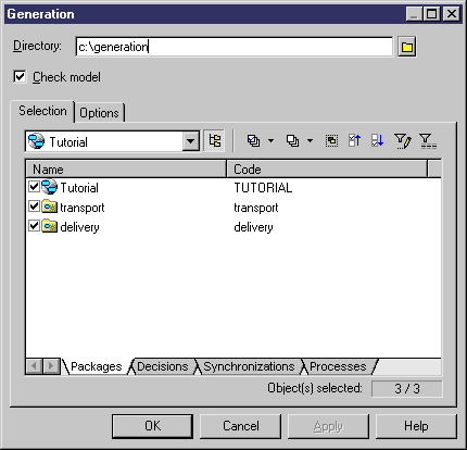 You select objects for generation from the Selection tab of the Generation dialog box. The selection tab contains sub-tabs for selecting specific objects of the model.