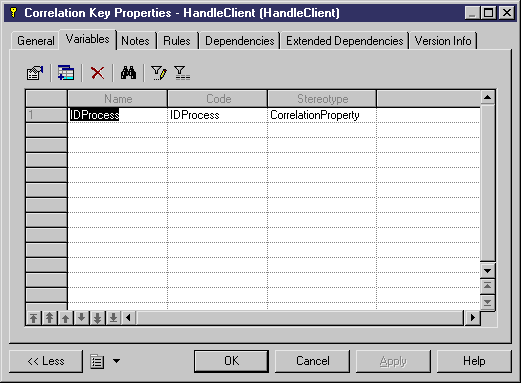 You design a correlation using a correlation key. You create a correlation key from the List of Correlation Keys or using the New command in the model contextual menu, and you add variables to the correlation key from the Variables tab of the correlation key property sheet. Correlation variables must have the <<CorrelationProperty>> stereotype.