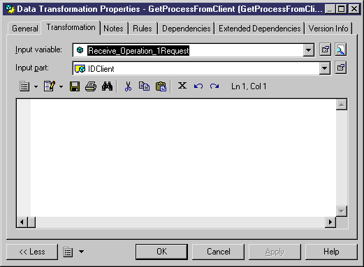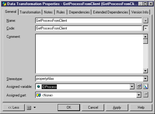 Before associating a correlation key to an activity, you must design a data transformation that expresses how to obtain the properties of the correlation from the received or the sent message. You create one or several data transformations with the <<propertyAlias>> stereotype for each activity that uses a correlation key; each data transformation must have the reception/emission message mapping variable as the input variable: