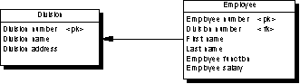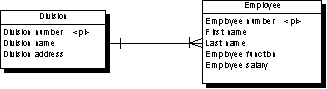 The CDM below shows an independent relationship. Each division contains one or more employees: