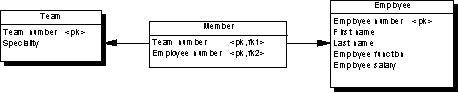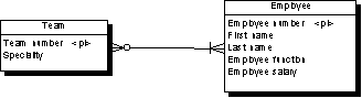In independent many-to-many relationships, the primary identifiers of both entities migrate to a join table as primary/foreign keys. The CDM below shows an independent relationship. Each employee can be a member of one or more teams, and each team can have one or more employees as members.