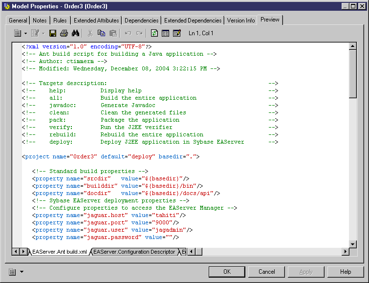 - Click the Ant build.xml tab to preview the Ant build.xml file.