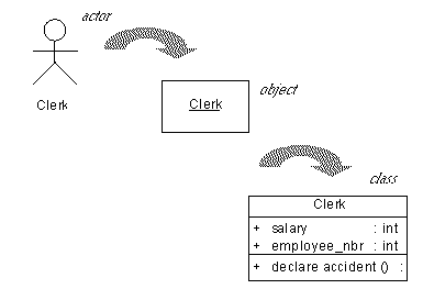 The clerk actor becomes an object in a collaboration or sequence diagram; those diagrams representing the actions between the objects, the clerk as an object receives messages from customers and sends messages to his manager, for example.