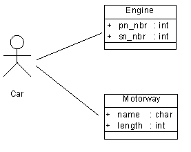 For example, an actor Car needs the classes Engine and Motorway to perform its task. They are shown as related to the actor in the figure below.
