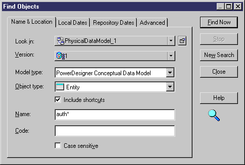 You can type string expressions in the Name and Code boxes of the Find Objects dialog box. String expressions are a combination of characters and wildcards that let you define ranges of objects.