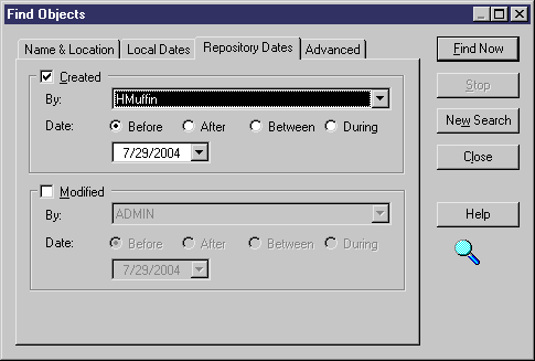 You can use creation parameters or modification parameters. You can also combine both criteria by selecting the Created and Modified check boxes.