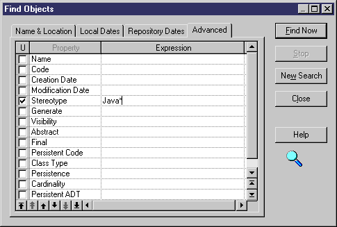 The Advanced tab displays a list of properties corresponding to the object type selected in the Name & Location tab. For example, if you select user in a PDM, the list displays Name, Code, Creation Date, Modification Date, Stereotype, and Generate propertie. You can select the check box in the U column to enable the property as a search criterion.
