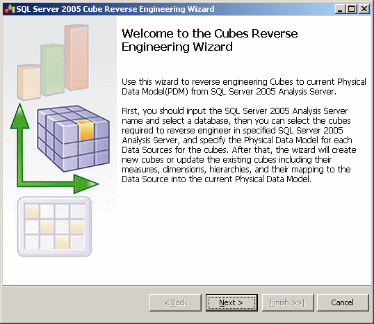 - Select Tools→Microsoft SQL Server 2005 Analysis Services→Reverse Engineer Cubes to open the wizard.
