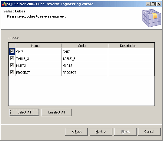 - The Select Cubes page lists the available cubes. Select the cubes you want to reverse engineer and then click Next to continue: