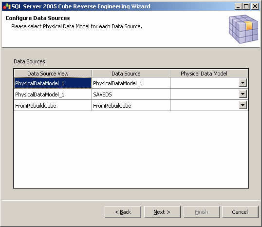 - The Configure Data Sources page lists the data sources that are required to populate the selected cubes. For each source, select the Physical Data Model in which the tables are modeled, and then click Next to continue: