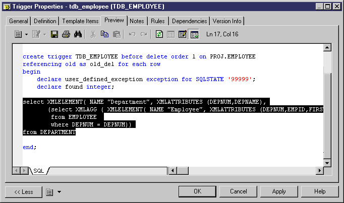Avoids typing a SQL/XML query in the definition of a trigger, a procedure or a function. Use one of the following tools: