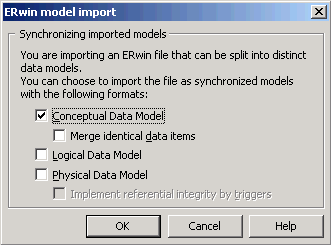 The options available depend on the type of ERwin model that you are importing. The traditional approach to data modeling in PowerDesigner is to create a Conceptual Data Model synchronized with a Physical Data Model. The full set of options is as follows:
