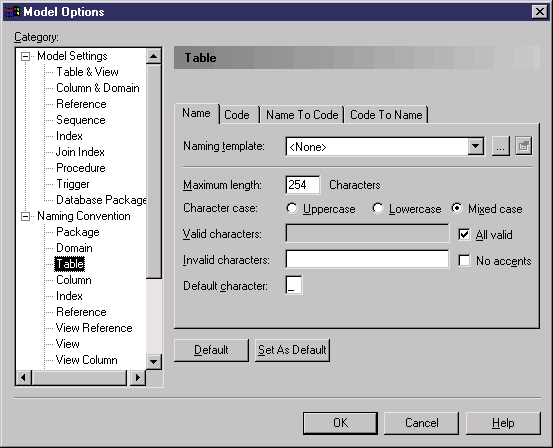 Set up your object naming conventions and other model options: To control the naming conventions of model objects in PowerDesigner, select Tools→Model Options, and then click on the object entry in the Naming Convention category in the Category pane: