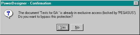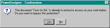 | Two sessions running on your workstation: for example, you are checking in a document in one session, and you want to lock a version of the same document from another PowerDesigner session | You must not bypass the temporary protection and wait for the check in to end |