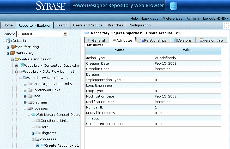 The Repository Explorer page is the main page of the Repository Web Browser. It contains on the left, a tree view of the contents of the repository, and on the right, the properties of the selected item: