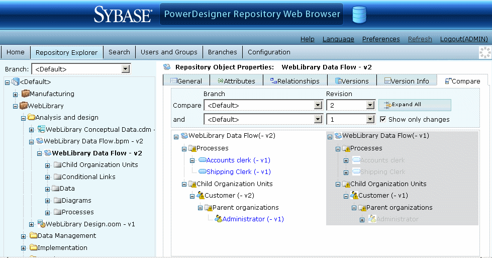 You can compare two versions of a PowerDesigner model or object in the Repository Web Browser to obtain a detailed list of the differences between them.