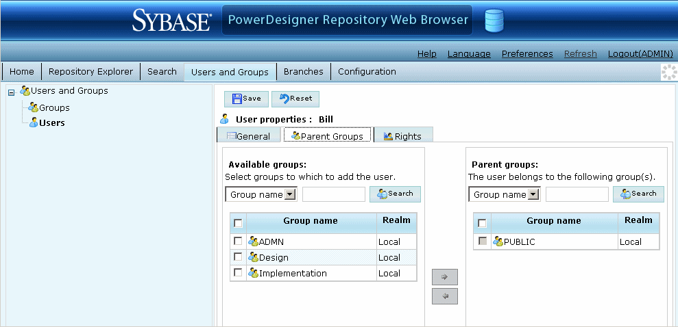 - Select one or more groups from the Available groups list, and then click the right-pointing arrow to join them and move them to the Parent groups list.