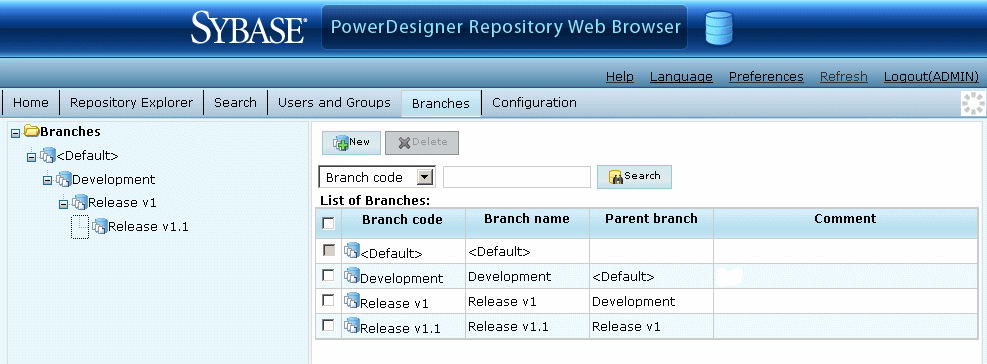 - Click the New button, select the existing branch under which you want to create the branch in the Parent branch list, and enter a branch name and code.