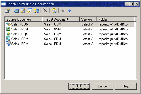 The Check In Multiple Documents window allows you to add multiple models and files to the repository and/or to check in changes to multiple repository models and files.
