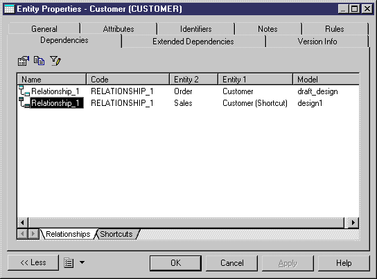 When you open the Dependencies tab of entity Customer in the target model, the following information appear to indicate that the entity has a shortcut and this shortcut is used by a relationship in another model: