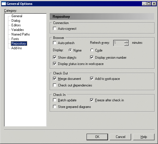 | Auto-connect | Automatically opens the last connected repository when you start a PowerDesigner session. |