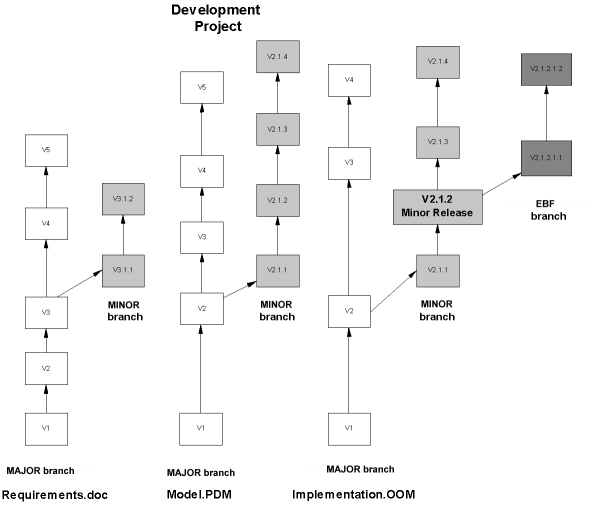 Depending on the type of release on which they are working, each engineer will choose a different branch to connect to in the repository, and will have access to different versions of the documents: