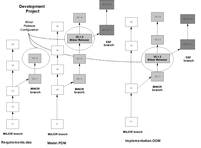 In the following example, the versions used for a minor release are circled, and are included in a configuration called Minor Release: