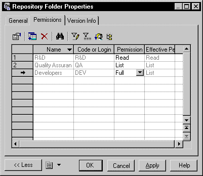 - For each user or group, select the access permission from the drop down list box in the Granted Permission column. The following permissions are available: